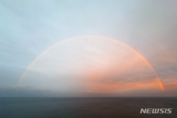 [샌디에이고=AP/뉴시스] 1일(현지시각) 미 캘리포니아주 샌디에이고의 블랙 비치에서 바라본 태평양 상공에 무지개가 드리워져 있다. 국립기상청(NWS)은 캘리포니아주가 '대기의 강' 영향권에 들어가면서 오는 5일까지 폭우와 폭설, 강풍이 이어질 것으로 예보했다. 2024.02.02.