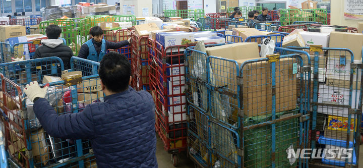 [전주=뉴시스] 김얼 기자 = 민족의 대 명절인 설을 앞둔 2일 전북 전주시 전주우체국에서 직원들이 택배를 운반하며 분주하게 움직이고 있다. 2024.02.02. [email protected]