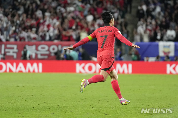 [알와크라=AP/뉴시스] 손흥민이 2일(현지시각) 카타르 알와크라의 알자누브 스타디움에서 열린 2023 아시아축구연맹(AFC) 아시안컵 8강전 호주와의 경기 연장 전반 14분 프리킥으로 역전 골을 넣은 후 세리머니하고 있다. 한국이 2-1로 힘겹게 승리하고 4강에 올라 요르단과 결승행을 다툰다. 2024.02.03.