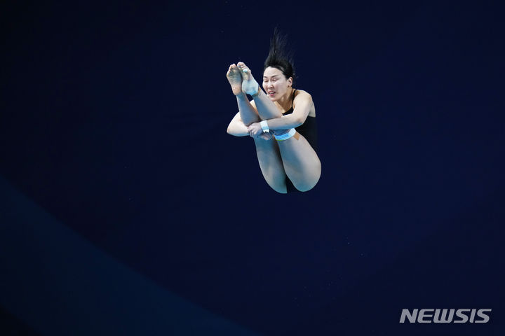 [도하=AP/뉴시스] 김수지가 2일(현지시각) 카타르 도하 하마드 아쿠아틱센터에서 열린 2024 세계수영선수권대회 다이빙 여자 1m 스프링보드 결승에서 연기를 펼치고 있다. 예선 2위로 결승에 올랐떤 김수지는 1∼5차 시기 합계 248.60점으로 8위를 기록했다. 2024.02.03.