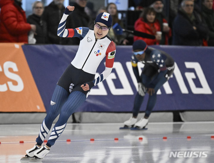 [퀘벡=AP/뉴시스] 김민선이 3일(현지시각) 캐나다 퀘벡에서 열린 2023-24 국제빙상경기연맹(ISU) 스피드스케이팅 월드컵 6차 대회 여자 500m 1차 레이스에서 1위로 골인한 후 기뻐하고 있다. 김민선은 37초69를 기록하며 금메달을 목에 걸어 올 시즌 3차, 4차 대회에 이어 3번째 정상에 올랐다. 2024.02.04.