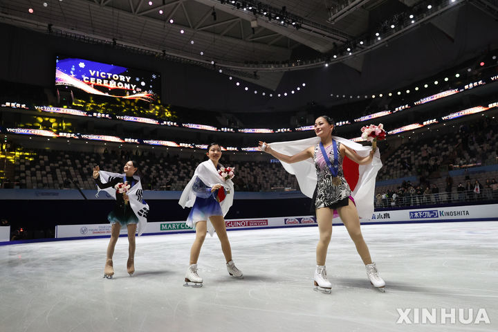[상하이=신화/뉴시스] 피겨스케이팅 김채연(왼쪽) 선수가 2일(현지시간) 중국 상하이에서 열린 2024 국제빙상경기연맹(ISU) 피겨 사대륙선수권대회 여자 싱글 종목 은메달을 획득, 시상식을 마친 뒤 금메달 일본의 지바 모네(가운데), 동메달 일본의 와타나베 린카와 함께 관중들에게 인사하고 있다. 2024.02.04.