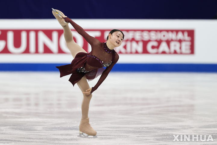 [상하이=신화/뉴시스] 피겨스케이팅 김채연 선수가 1일(현지시간) 중국 상하이에서 열린 2024 국제빙상경기연맹(ISU) 피겨 사대륙선수권대회 여자 싱글 쇼트프로그램 연기를 하고 있다. 김채연은 2일 프리스케이팅 경기와 합산, 여자 싱글 종목 은메달을 획득했다. 2024.02.04.