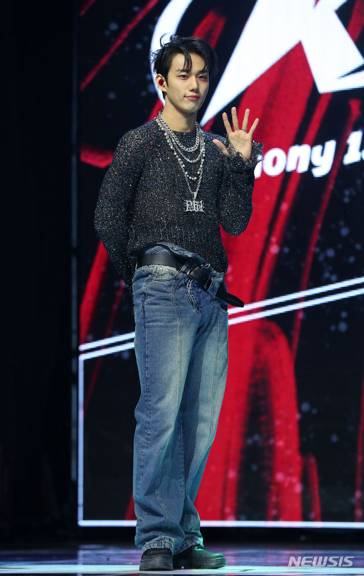 [서울=뉴시스] 김혜진 기자 = 그룹 피원하모니(P1Harmony) 인탁이 5일 오후 서울 광진구 예스24라이브홀에서 열린 첫 번째 정규 앨범 '때깔 (Killin' It)' 발매 기념 쇼케이스에서 포즈를 취하고 있다. 2024.02.05. [email protected]