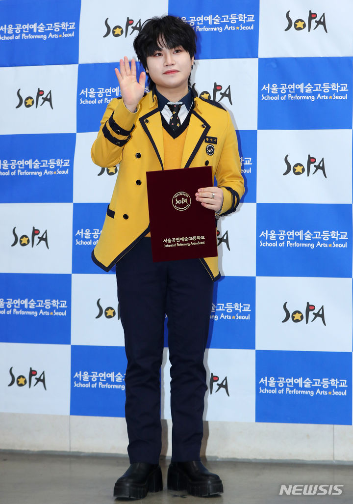 [서울=뉴시스] 김혜진 기자 = 가수 황민우가 7일 오전 서울 구로구 서울공연예술고등학교 13회 졸업식에서 포즈를 취하고 있다. 2024.02.07. [email protected]