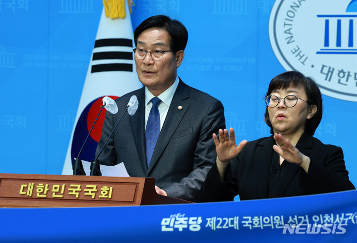 [서울=뉴시스] 고범준 기자 = 신동근 더불어민주당 의원이 7일 오후 서울 여의도 국회 소통관에서 제22대 총선 인천 서구을 출마선언 기자회견을 하고 있다. 2024.02.07. [email protected]