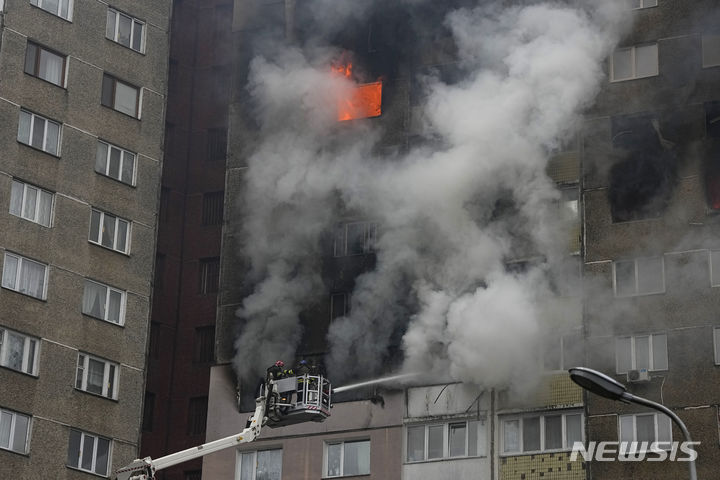 [키이우=AP/뉴시스] 7일(현지시각) 우크라이나 키이우에서 소방관들이 러시아군의 공습으로 불타는 아파트 화재를 진압하고 있다. 현지 당국은 러시아가 우크라이나 전역을 겨냥해 미사일과 드론 등을 발사해 최소 5명이 숨지고 40여 명이 다쳤다고 밝혔다. 2024.02.08.