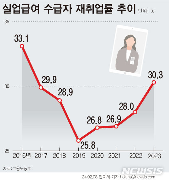 [서울=뉴시스] 고용노동부는 지난해 실업급여 수급기간 중 재취업한 사람의 비율이 30.3%를 기록했다고 8일 밝혔다. 재취업률이 30%대를 기록한 것은 2016년(33.1%) 이후 7년 만에 처음이다. (그래픽=안지혜 기자)