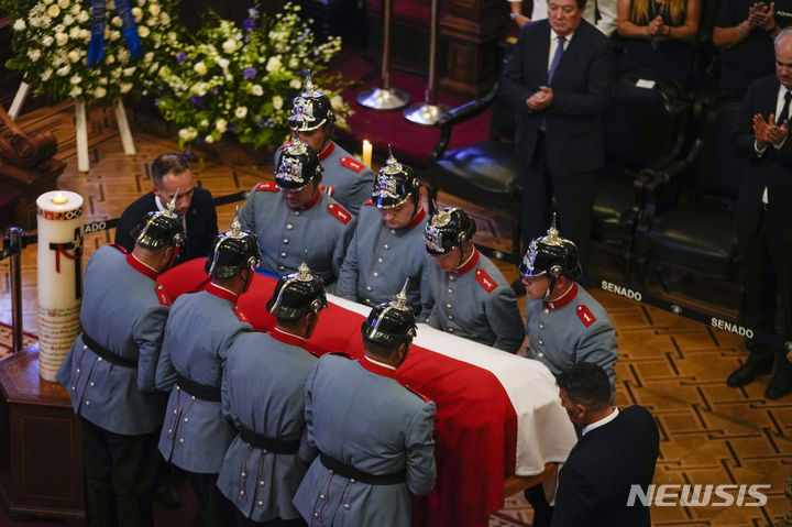 [산티아고=AP/뉴시스] 칠레 의장대가 7일(현지시각) 세바스티안 피녜라 전 칠레 대통령의 유해를 빈소가 마련된 산티아고 의사당에 안치하고 있다. 전날 헬기 추락으로 숨진 피녜라 전 대통령의 빈소는 산티아고의 의사당에 마련됐으며 가브리엘 보리치 대통령은 사흘 간의 애도기간을 선포했다. 장례식은 9일 추모 공원 묘원에서 국장으로 치러진다. 2024.02.08.