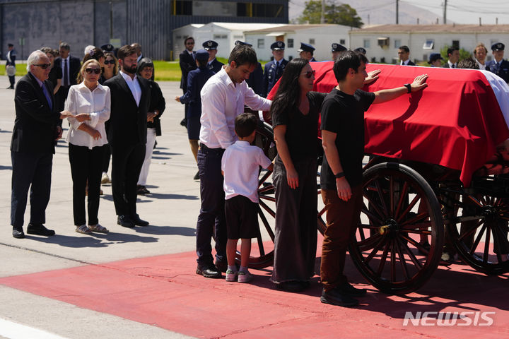 [산티아고=AP/뉴시스] 세바스티안 피녜라 전 칠레 대통령의 부인 세실리아 모렐(왼쪽 두 번째) 여사가 7일(현지시각) 산티아고 공항에 도착한 피녜라 전 대통령의 유해를 가브리엘 보리치(왼쪽 세 번째) 대통령과 함께 바라보고 있다. 전날 헬기 추락으로 숨진 피녜라 전 대통령의 빈소가 산티아고의 의사당에 마련돼 조문객이 밀려들고 있다. 보리치 대통령은 사흘 간의 애도기간을 선포했으며 장례식은 9일 추모 공원 묘원에서 국장으로 치러진다. 2024.02.08.
