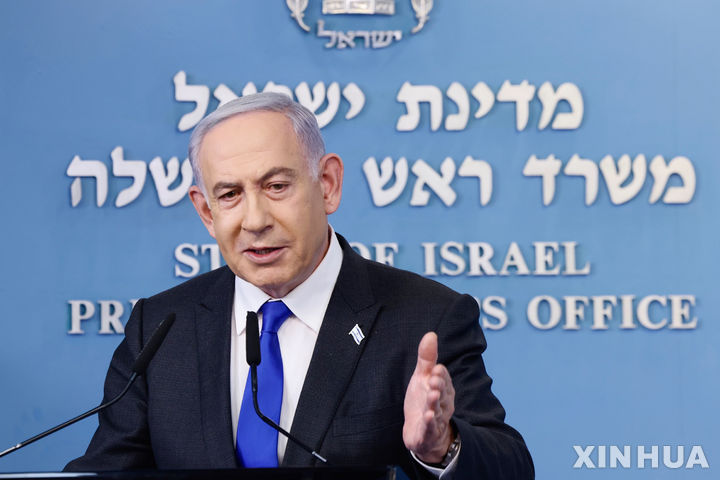 [예루살렘=신화/뉴시스] 베냐민 네타냐후 이스라엘 총리가 7일(현지시각) 예루살렘 집무실에서 기자회견하고 있다. 네타냐후 총리는 "하마스의 기이한 요구에 굴복한다면 인질 석방을 끌어내지 못할 뿐 아니라 또 다른 대학살을 자초하는 일"이라며 무장 정파 하마스가 제시한 휴전안을 거부했다. 2024.02.08.