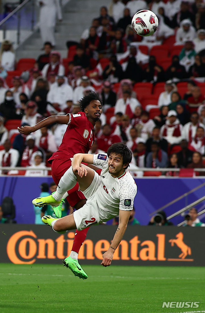 [도하(카타르)=뉴시스] 김근수 기자 = 7일(현지시간) 카타르 도하 알투마마 스타디움에서 열린 아시아축구연맹(AFC) 2023 카타르 아시안컵 4강전 이란 대 카타르의 경기, 전반 이란 아즈문이 오버헤드킥 선취골을 넣고 있다. 2024.02.08. [email protected]