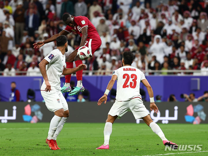 [도하(카타르)=뉴시스] 김근수 기자 = 7일(현지시간) 카타르 도하 알투마마 스타디움에서 열린 아시아축구연맹(AFC) 2023 카타르 아시안컵 4강전 이란 대 카타르의 경기, 후반 카타르 알모에즈 알리가 헤딩슛을 하고 있다. 2024.02.08. [email protected]