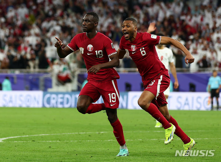 [도하(카타르)=뉴시스] 김근수 기자 = 7일(현지시간) 카타르 도하 알투마마 스타디움에서 열린 아시아축구연맹(AFC) 2023 카타르 아시안컵 4강전 이란 대 카타르의 경기, 후반 카타르 알모에즈 알리가 역전골을 넣고 기뻐하고 있다. 2024.02.08. [email protected]