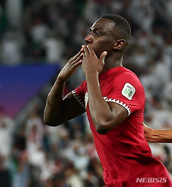 [도하(카타르)=뉴시스] 김근수 기자 = 7일(현지시간) 카타르 도하 알투마마 스타디움에서 열린 아시아축구연맹(AFC) 2023 카타르 아시안컵 4강전 이란 대 카타르의 경기, 후반 카타르 알모에즈 알리가 역전골을 넣고 기뻐하고 있다. 2024.02.08. [email protected]