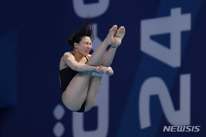 [도하=AP/뉴시스] 김수지가 8일(현지시각) 카타르 도하 하마드 아쿠아틱센터 열린 2024 국제수영연맹 세계선수권대회 다이빙 여자 스프링보드 3m 예선에서 연기하고 있다. 김수지는 257.55점으로 52명 중 15위를 기록해 18명이 겨루는 준결승에 진출했다. 2024.02.09.