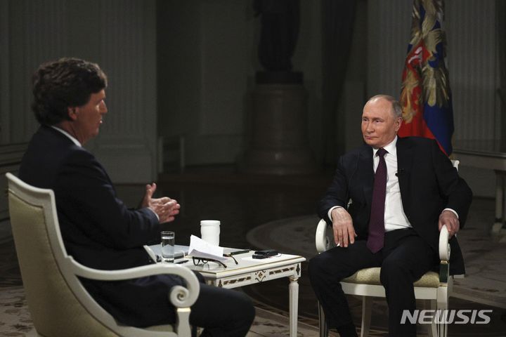 [모스크바=AP/뉴시스]9일 러시아 스푸트니크 통신이 공개한 사진에서 블라디미르 푸틴 러시아 대통령(오른쪽)이 지난 6일 모스크바 크렘린궁에서 폭스뉴스 진행자 터커 칼슨과 인터뷰하고 있다. 그는 미국이 러시아의 이익을 인정하고, 우크라이나가 회담에 응하도록 설득해야 한다고 촉구했다. 2024.02.09.
