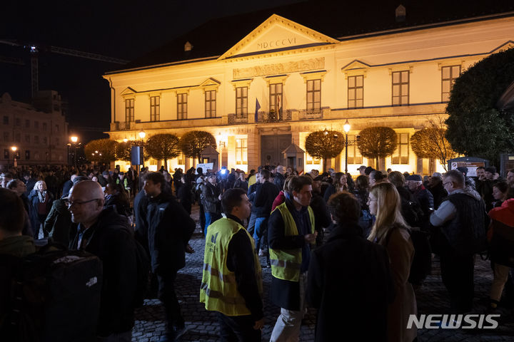 [부다페스트(헝가리)=AP/뉴시스]헝가리 부다페스트의 대통령 집무실 산도르궁 앞에서 10일(현지시간) 카탈린 노바크 대통령의 퇴진을 촉구하는 시위가 벌어지고 있다. 노바크 대통령은 이날 아동 성폭력 사건의 공범으로 유죄 판결을 받은 한 남성을 사면한 것에 대한 국민들의 거센 항의로 결국 사임했다. 그녀의 사임은 오랫동안 집권해온 빅토르 오르반 총리의 민족주의 정부에 전례 없는 정치적 스캔들을 촉발시키며 타격을 가했다. 2024.02.11.