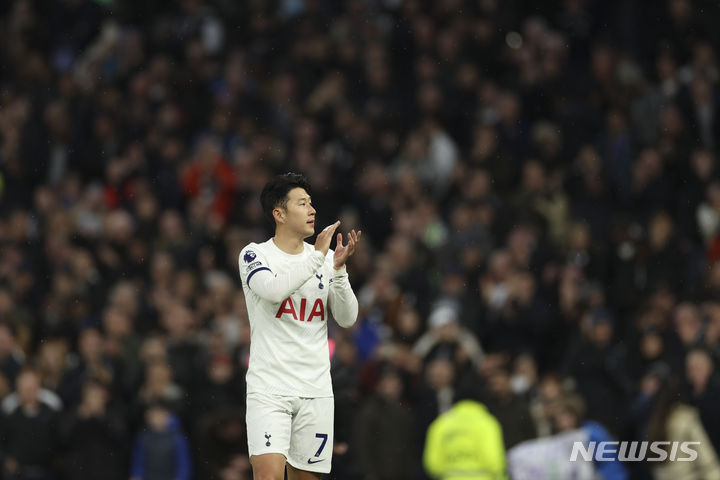 [런던=AP/뉴시스] 2023 아시아축구연맹(AFC) 카타르 아시안컵을 마친 후 소속팀 토트넘에 복귀한 손흥민이 11일(한국시간) 잉글랜드 런던 토트넘 홋스퍼 경기장에서 열린 '2023~2024 잉글랜드 프로축구 프리미어리그(EPL)' 24라운드 토트넘과 브라이턴의 경기에서 2-1 승리를 거둔 후 팬들에게 손뼉을 치고 있다. 이날 토트넘은 후반 추가시간 극장골로 승리를 거두며 4위로 도약했다. 2024.02.11.
