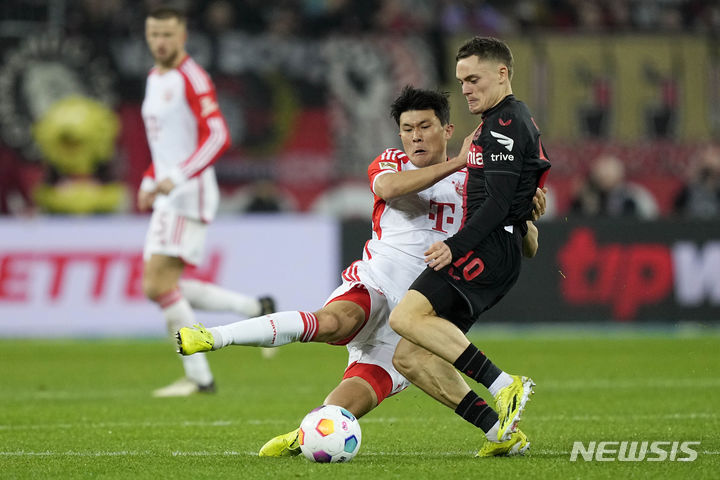 [레버쿠젠=AP/뉴시스] 바이에른 뮌헨의 김민재(왼쪽)가 10일(현지시각) 독일 레버쿠젠의 바이아레나에서 열린 2023~24 독일 분데스리가 21라운드 레버쿠젠과의 경기에 선발 출전해 공을 다투고 있다. 아시안컵에서 복귀한 김민재는 풀타임을 소화했으나 팀의 0-3 완패를 막진 못했다. 2024.02.11.