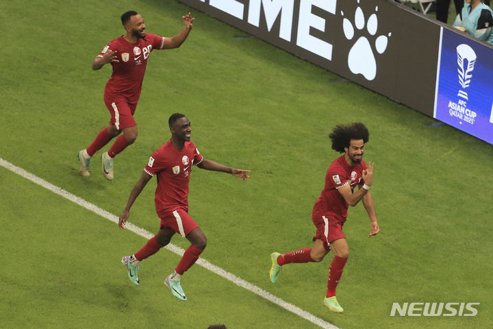 [루사일=AP/뉴시스] 카타르의 아크람 아피프(오른쪽)가 10일(현지시각) 카타르 루사일 스타디움에서 열린 2023 아시아축구연맹(AFC) 아시안컵 결승전 요르단과의 경기 후반 추가시간 세 번째 골을 넣고 세리머니하고 있다. 아피프는 페널티킥으로 해트트릭을 기록하며 팀의 3-1 승리와 대회 2연패를 이끌었고 8득점으로 득점왕에도 올랐다. 2024.02.11.