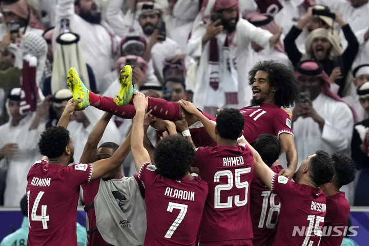 [루사일=AP/뉴시스] 카타르의 아크람 아피프가 10일(현지시각) 카타르 루사일 스타디움에서 열린 2023 아시아축구연맹(AFC) 아시안컵 결승전 요르단과의 경기 후반 추가시간 세 번째 골을 넣고 승리하며 헹가래를 받고 있다. 아피프는 페널티킥으로 해트트릭을 기록하며 팀의 3-1 승리와 대회 2연패를 이끌었고 8득점으로 득점왕에도 올랐다. 2024.02.11.