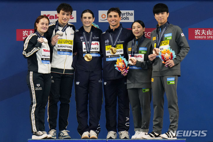 [도하=AP/뉴시스] 김수지-이재경(오른쪽)이 10일(현지시각) 카타르 도하의 하마드 아쿠아틱센터에서 열린 2024 세계수영선수권 다이빙 혼성 싱크로 3m 스프링보드 시상대에 올라 동메달을 목에 걸고 포즈를 취하고 있다. 김수지와 이재경은 합계 285.03점을 얻어 3위에 올라 한국 선수로는 종목 사상 처음으로 시상대에 올랐다. 2024.02.11
