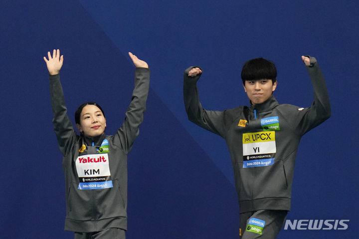 [도하=AP/뉴시스] 김수지(왼쪽)와 이재경이 10일(현지시각) 카타르 도하의 하마드 아쿠아틱센터에서 열린 2024 세계수영선수권 다이빙 혼성 싱크로 3m 스프링보드 시상식에 참석해 인사하고 있다. 김수지와 이재경은 합계 285.03점을 얻어 3위에 올라 한국 선수로는 종목 사상 처음으로 시상대에 올랐다. 2024.02.11.
