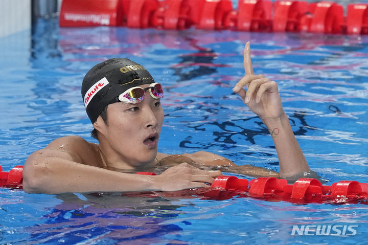 [도하=AP/뉴시스] 김우민이 11일(현지시각) 카타르 도하의 어스파이어돔에서 열린 2024 국제수영연맹 세계선수권대회 남자 자유형 400m 결승에서 1위로 골인한 후 세리머니하고 있다. 김우민은 3분42초71의 개인 최고 기록으로 금메달을 목에 걸었다. 2024.02.12.