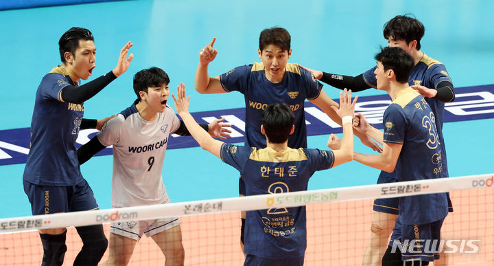 [서울=뉴시스] 김선웅 기자 = 12일 서울 중구 장충체육관에서 열린 2023-2024 V-리그 남자부 우리카드 우리WON 배구단과 현대캐피탈 스카이워커스의 경기, 우리카드 선수들이 득점 후 기뻐하고 있다. 2024.02.12. [email protected]
