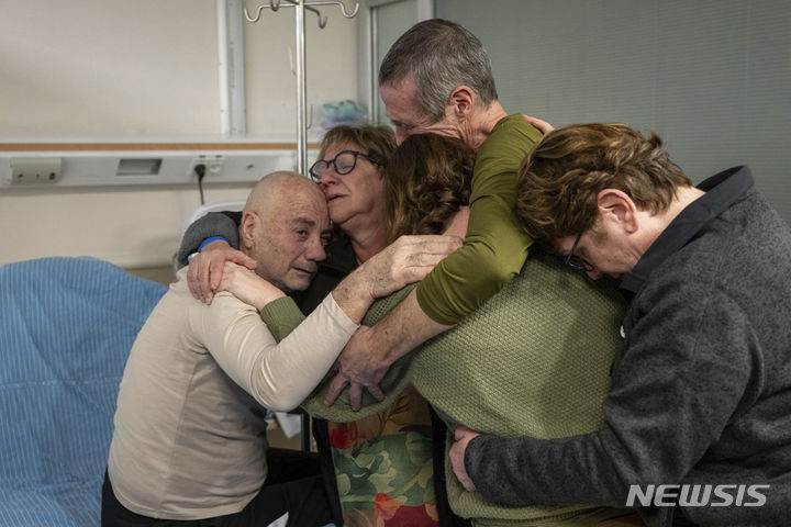 [라마트간=AP/뉴시스] 하마스에 억류됐다가 구조된 루이스 하르(왼쪽, 71)가 12일(현지시각) 이스라엘 라마트간의 한 병원에서 가족들과 재회하고 있다. 이스라엘군은 가자지구 남부 라파의 한 아파트를 급습해 인질로 잡혀 있던 하르와 페르난도 마르만(61)을 구조했다고 밝혔다. 2024.02.13.