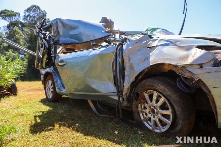 [우아신 기슈=신화/뉴시스] 12일(현지시각) 케냐 북서부 우아신 기슈 카운티에서 케냐 마라토너 켈빈 키프텀이 타고 있던 자동차가 사고로 찌그러져 있다. 케냐 경찰은 세계 최초로 마라톤 2시간 1분 벽을 깬 남자 마라톤 세계 기록 보유자인 키프텀이 11일 발생한 교통사고로 숨졌다고 밝혔다. 향년 24세. 2024.02.13.