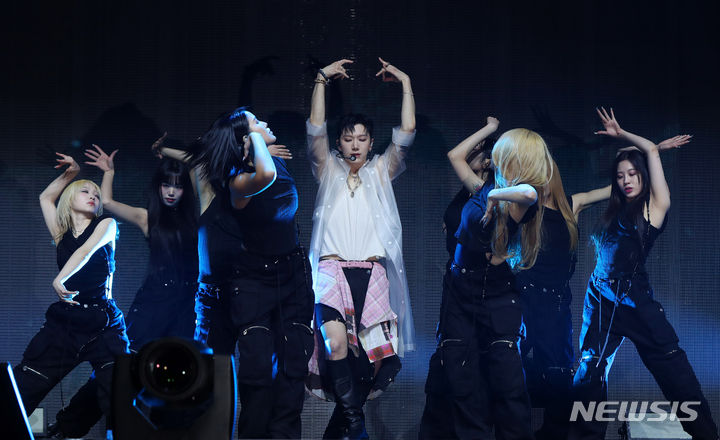 [서울=뉴시스] 김혜진 기자 = 그룹 NCT 텐이 13일 오후 서울 광진구 예스24라이브홀에서 열린 솔로 첫 번째 미니앨범 '텐(TEN)' 발매 기념 쇼케이스에서 무대를 선보이고 있다. 2024.02.13. [email protected]