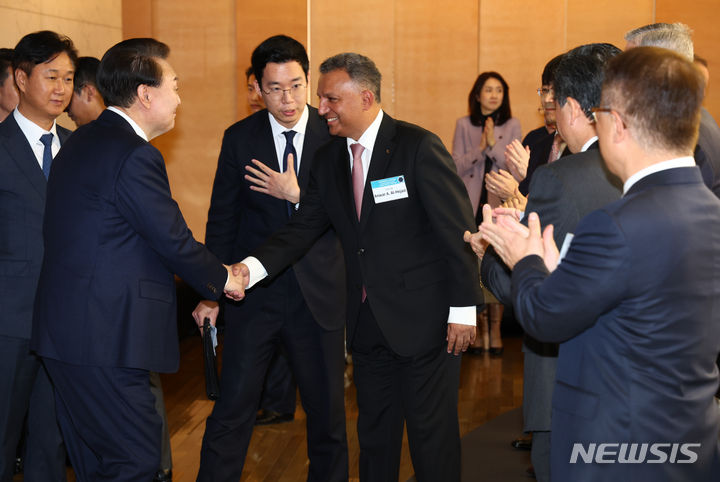 [서울=뉴시스] 전신 기자 = 윤석열 대통령이 14일 서울 중구 대한상공회의소에서 열린 외국인투자기업 오찬간담회에 입장하며 안와르 에이 알히즈아지 에쓰오일 대표와 악수하고 있다. 2024.02.14. [email protected]