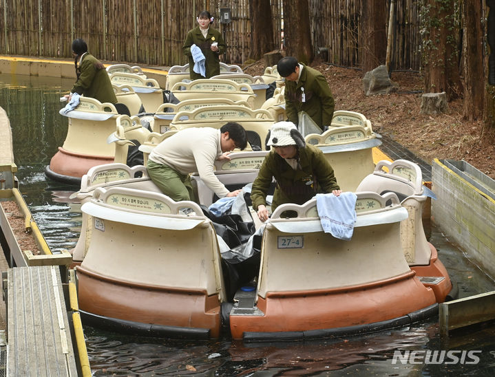 [용인=뉴시스] 김종택 기자 = 포근한 날씨를 보인 14일 경기도 용인시 에버랜드에서 겨울철 운행을 중단했던 아마존익스프레스 보트를 관계자들이 청소 및 점검하고 있다. 아마존익스프레스는 오는 16일 본격적인 운행에 들어간다. 2024.02.14. [email protected]