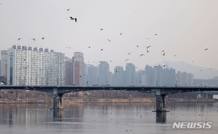[서울=뉴시스] 김선웅 기자 = 서울 낮 최고기온이 16도를 기록한 14일 오후 서울 여의도 인근 한강에서 괭이갈매기·재갈매기떼가 비행하고 있다. 2024.02.14. [email protected]