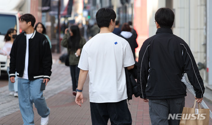 [대구=뉴시스] 이무열 기자 = 낮 최고기온이 17도까지 올라 포근한 날씨를 보인 14일 대구 중구 동성로에서 한 시민이 반팔을 입고 길을 걷고 있다. 2024.02.14. [email protected]