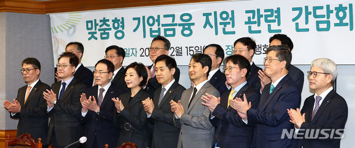 [서울=뉴시스] 김근수 기자 = 김주현 금융위원장 등 참석자들이 15일 서울 중구 은행회관에서 열린 맞춤형 기업금융 지원 관련 간담회에서 기념촬영을 하고 있다. (앞줄 왼쪽 두번째부터 강석훈 KDB산업은행 회장, 조용병 전국은행연합회 회장, 오영주 중소벤처기업부 장관, 김 위원장, 안덕근 산업통상자원부 장관) 2024.02.15. [email protected]