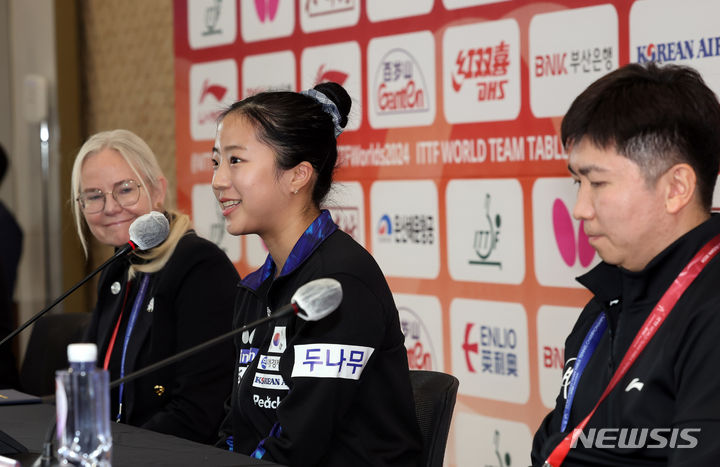 [부산=뉴시스] 하경민 기자 = 15일 부산 해운대구 벡스코 컨벤션홀에 마련된 'BNK부산은행 2024부산세계탁구선수권대회' 미디어센터에서 페트라쇠링(맨 왼쪽부터) ITTF 회장, 한국 여자 탁구 대표팀 신유빈 선수, 류승민 조직위 공동위원장 등이 공식 기자회견을 갖고 있다. 오는 16~25일 열리는 이번 대회에는 남녀 각 40개국이 5개국씩 8개 조로 나뉘어 단체전 예선 리그를 벌인 이후 각 조 3위까지 24강 토너먼트로 순위 경쟁을 펼친다. 특히 이번 대회를 통해 2024 파리올림픽 출전권 16장(남·여 각 8장)이 주어진다. 2024.02.15. [email protected]