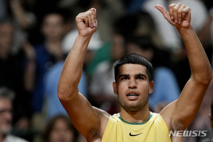 [부에노스아이레스=AP/뉴시스] 카를로스 알카라스(2위·스페인)가 15일(현지시각) 아르헨티나 부에노스아이레스에서 열린 남자프로테니스(ATP) 투어 아르헨티나 오픈(ATP250) 16강전에서 카밀로 우고 카라벨리(134위·아르헨티나)를 꺾고 환호하고 있다. 알카라스가 2-0(6-1 7-5)으로 승리하고 8강에 올랐다. 2024.02.16.