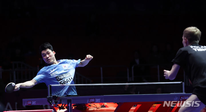 [부산=뉴시스] 하경민 기자 = 16일 부산 해운대구 벡스코 제1전시장에서 열린 'BNK부산은행 2024부산세계탁구선수권대회'에 출전한 한국 남자 대표팀 장우진 선수가 폴란드 선수와 기량을 겨루고 있다. 2024.02.16. [email protected]