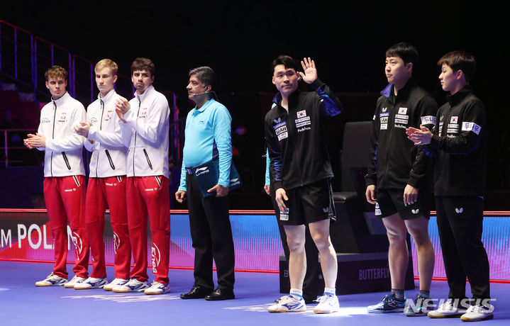 [부산=뉴시스] 하경민 기자 = 16일 부산 해운대구 벡스코 제1전시장에서 열린 'BNK부산은행 2024부산세계탁구선수권대회'에 출전한 한국과 폴란드 남자 대표팀이 소개되고 있다. 2024.02.16. [email protected]