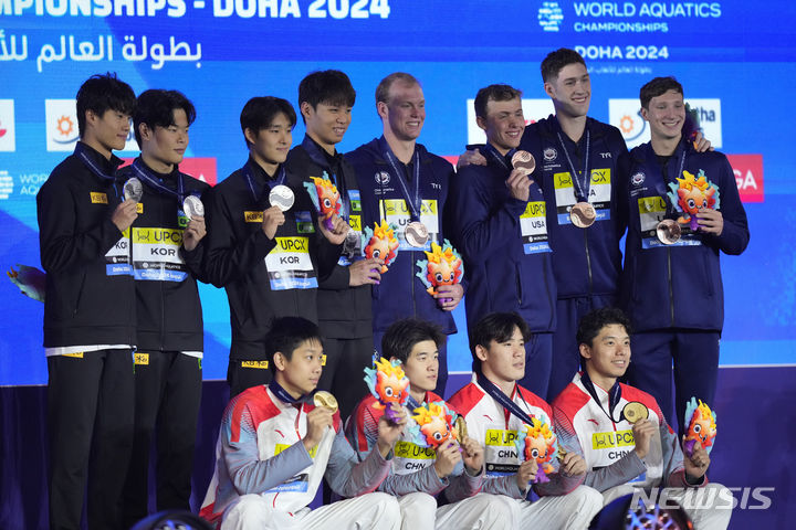 [도하=AP/뉴시스] 한국 남자 수영 대표팀(왼쪽)이 16일(현지시각) 카타르 도하의 어스파이어돔에서 열린 2024 국제수영연맹 세계선수권대회 4x200m 자유형 계영 은메달을 따낸 후 시상대에 올라 기념 촬영하고 있다. 황선우(왼쪽부터), 이호준, 김우민, 양재훈이 출전한 한국은 7분01초94로 1위 중국에 0.1초 뒤져 은메달을 목에 걸었다. 2024.02.17.