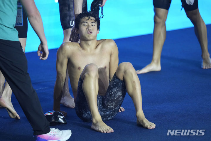 [도하=AP/뉴시스] 황선우가 16일(현지시각) 카타르 도하의 어스파이어돔에서 열린 2024 국제수영연맹 세계선수권대회 남자 4x200m 자유형 계영 결승전 마지막 영자로 나서 경기 후 숨을 고르고 있다. 황선우, 이호준, 양재훈, 김우민이 출전한 한국은 7분01초94로 1위 중국에 0.1초 뒤져 은메달을 목에 걸었다. 2024.02.17.
