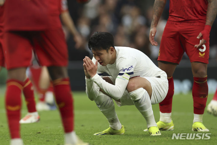 [런던=AP/뉴시스] 토트넘 홋스퍼의 손흥민이 17일(현지시각) 영국 런던의 토트넘 홋스퍼 스타디움에서 열린 2023-24 잉글랜드 프로축구 프리미어리그(EPL) 25라운드 울버햄프턴과의 경기에서 패한 후 아쉬워하고 있다. 손흥민은 침묵했고 토트넘은 1-2로 패해 5위로 내려섰다. 2024.02.18.