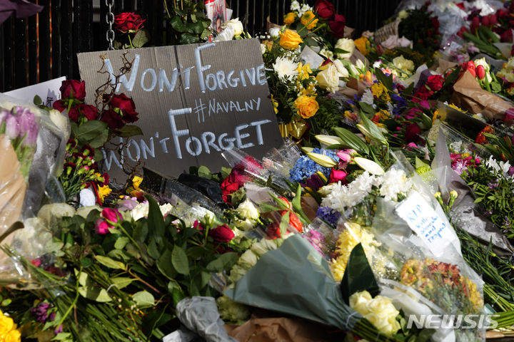 [런던=AP/뉴시스] 18일(현지시각) 영국 런던에 있는 러시아 대사관 앞에  러시아 야권 지도자 알렉세이 나발니(47)의 죽음을 애도하는 꽃들과 손팻말이 놓여 있다. 나발니는 지난 16일 수감 중이던 러시아 최북단 시베리아 야말로네네츠 자치구 제3교도소에서 갑작스레 사망해 러시아인들에게 충격을 줬다. 그의 시신에서는 멍 자국과 심폐소생술(CPR)의 흔적이 발견된 것으로 알려졌다. 2024.02.19.