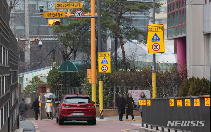 [서울=뉴시스] 조성우 기자 = 서울시가 어린이보호구역 내 보행 공간 확보가 어려운 폭 8m 미만의 이면도로 50곳을 추가 지정해 제한속도를 시속 30㎞에서 20㎞로 낮춘다. 19일 오후 서울 시내 한 초등학교 앞 20km 속도제한 스쿨존에서 차량과 시민들이 오가고 있다. 2024.02.19. xconfind@newsis.com