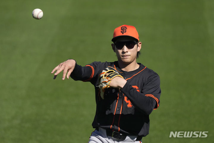 [스코츠데일=AP/뉴시스] 샌프란시스코 자이언츠의 이정후가 19일(현지시각) 미 애리조나주 스코츠데일에서 열린 스프링캠프에 참여해 공 받기를 하며 몸을 풀고 있다. 2024.02.20.