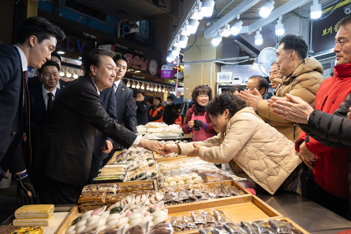 [울산=뉴시스] 윤석열 대통령이 21일 울산 남구 신정상가시장을 방문해 떡 가게 상인과 악수하고 있다. (사진=대통령실 제공) 2024.02.21. [email protected] *재판매 및 DB 금지