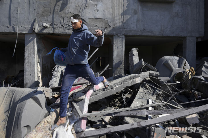 [가자지구=AP/뉴시스] 21일(현지시각) 가자지구 중부 데이르알발라에서 한 팔레스타인인이 이스라엘군의 공습을 받아 파괴된 건물 잔해 위를 지나가고 있다. 이스라엘 공군이 가자지구 중부 누세이라트 난민수용소의 한 건물을 폭격해 팔레스타인인 최소 17명이 숨지고 34명이 다쳤다고 현지 의료 관계자가 전했다. 2024.02.22.